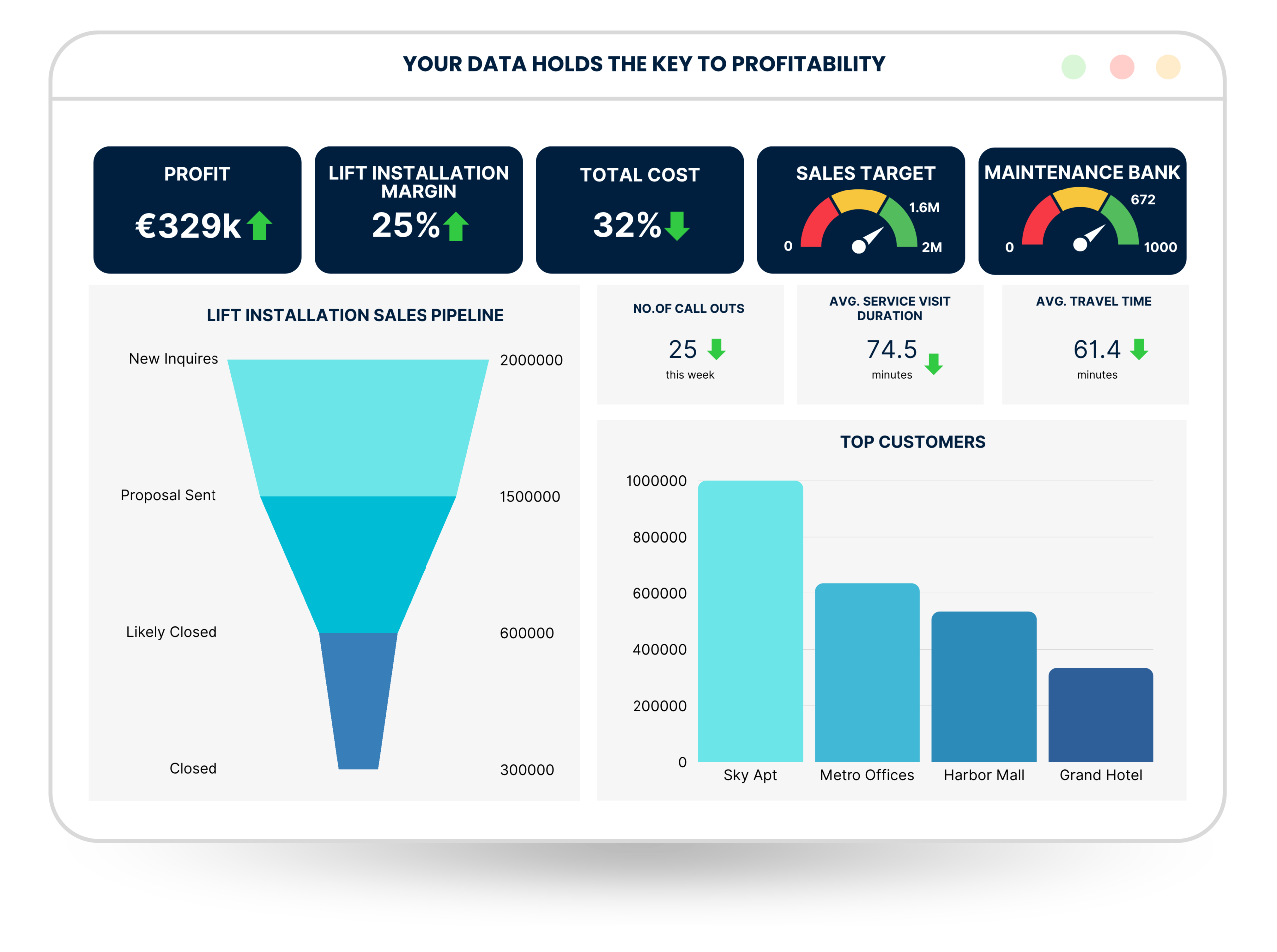 My work begins with a partnership with the management team to deeply understand your unique pain points and your strategic wish list - from closing new lift installation opportunities to optimising service schedules. I specialise in designing and implementing technical solutions that seamlessly integrate with your existing systems, empowering you to achieve your goals and solve critical challenges without a disruptive overhaul.